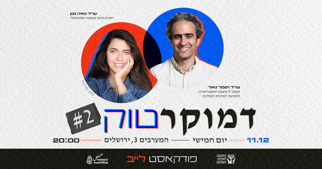 עו״ד גאיה גפן, יוצרת תוכן ומשפיענית רשת בתחום המשפטים והאקטואליה, אחד מהקולות הברורים והרהוטים של המחנה הליברלי בעת האחרונה. עו״ד תומר נאור, ירושלמי גאה וסמנכ״ל התנועה לאיכות השלטון ומעורכי הדין הבכירים בתנועה, פועל כבר שנים באמצעות כלים משפטיים להגנה וחיזוקה של הדמוקרטיה הישראלית.