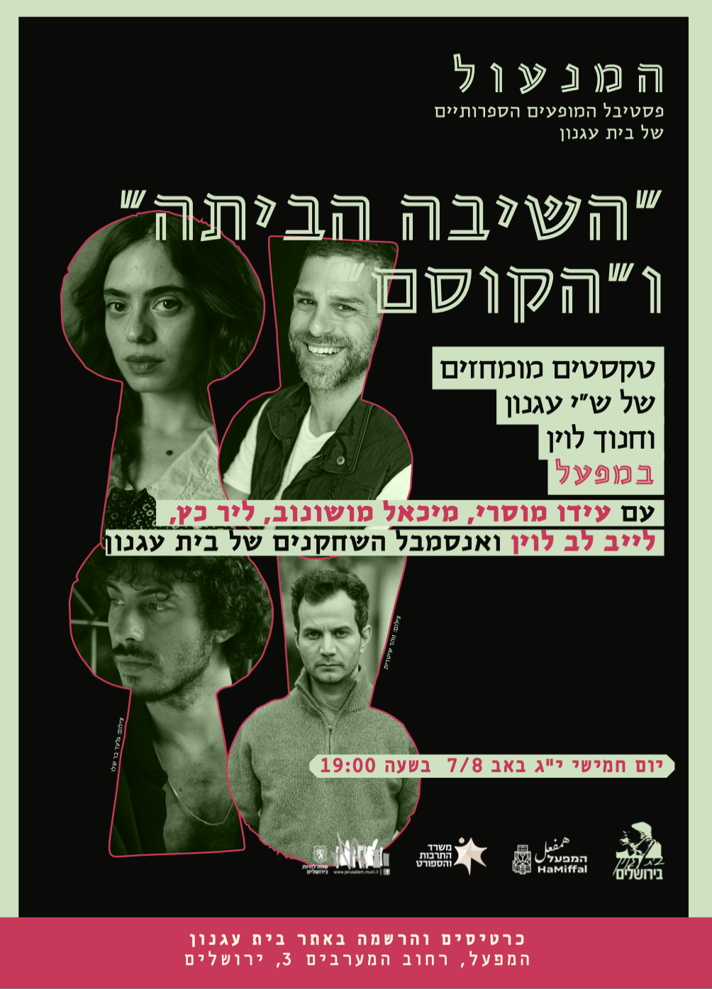 השחקנים מיכאל מושונוב, ליר כץ ולב לוין יקראו על הבמה שתי יצירות העוסקות בשיבה הביתה: פרנהיים של ש״י עגנון ו״החייל הרזה״ של חנוך לוין. ״הקוסם״ – השחקן עידו מוסרי יסיים בקריאה מומחזת של המערכונים הסאטיריים של חנוך לוין, בהשתתפות אנסמבל השחקנים של בית עגנון: מורן גלזר (פסנתרן ויוצר מוזיקה) ואסף אופק (מנהל אמנותי של בית עגנון, במאי ושחקן תיאטרון).